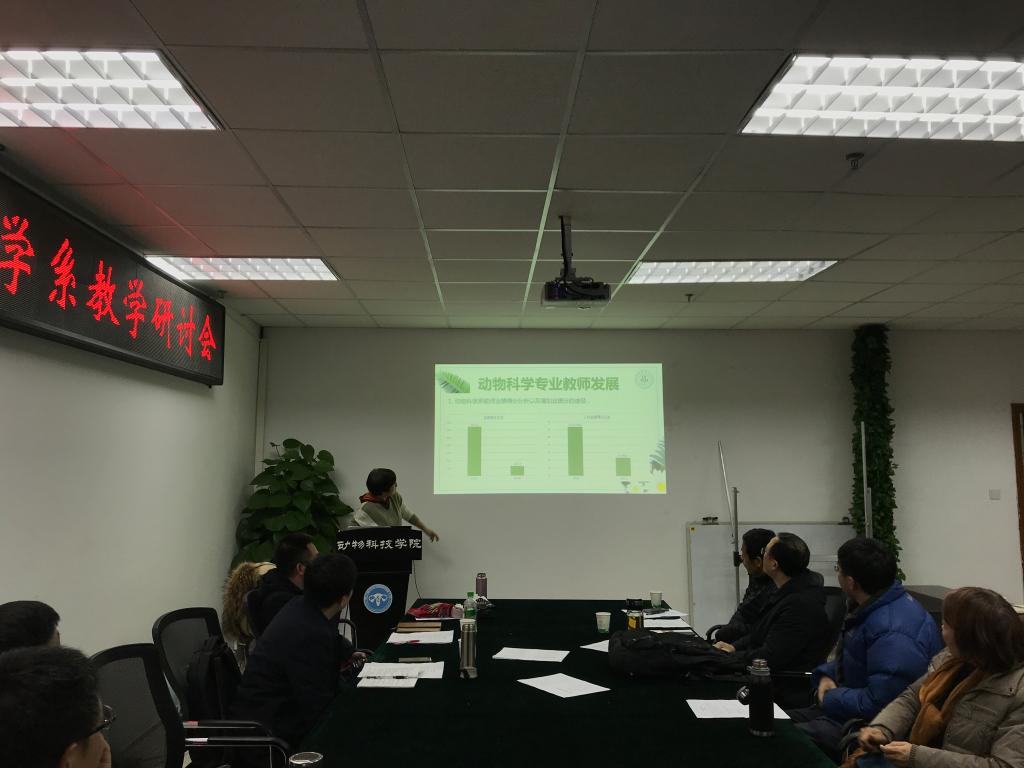 会上,动物科学系室主任张红平带领全体参会人员共同学习了新农科建设三部曲《安吉共识》《北大仓行动》和《北京指南》内容。为进一步推进新农科建设三部曲和促进动物科学国家一流专业的发展,对动物科学专业培养方案修订、课程教学大纲以及动物科学一流专业建设的举措提出意见并进行讨论。动科系副主任张明对动科专业课程包括创新创业教育示范课、在线开放课程和虚拟仿真实验项目等的建设现状及规划进行介绍。动科系副主任赵小玲则对动物科学专业教师发展进行探讨,如2019年本专业教师业绩分得分进行分析并整理和分享了教师提高业绩分途径和方法以及解读了教师职称晋升途径。随后动科系《特种经济动物养殖》课程负责人杨建东对本门课程教学大纲和教学内容进行介绍,参与人员对课程内容设置及教学手段和方法提出了改进意见。