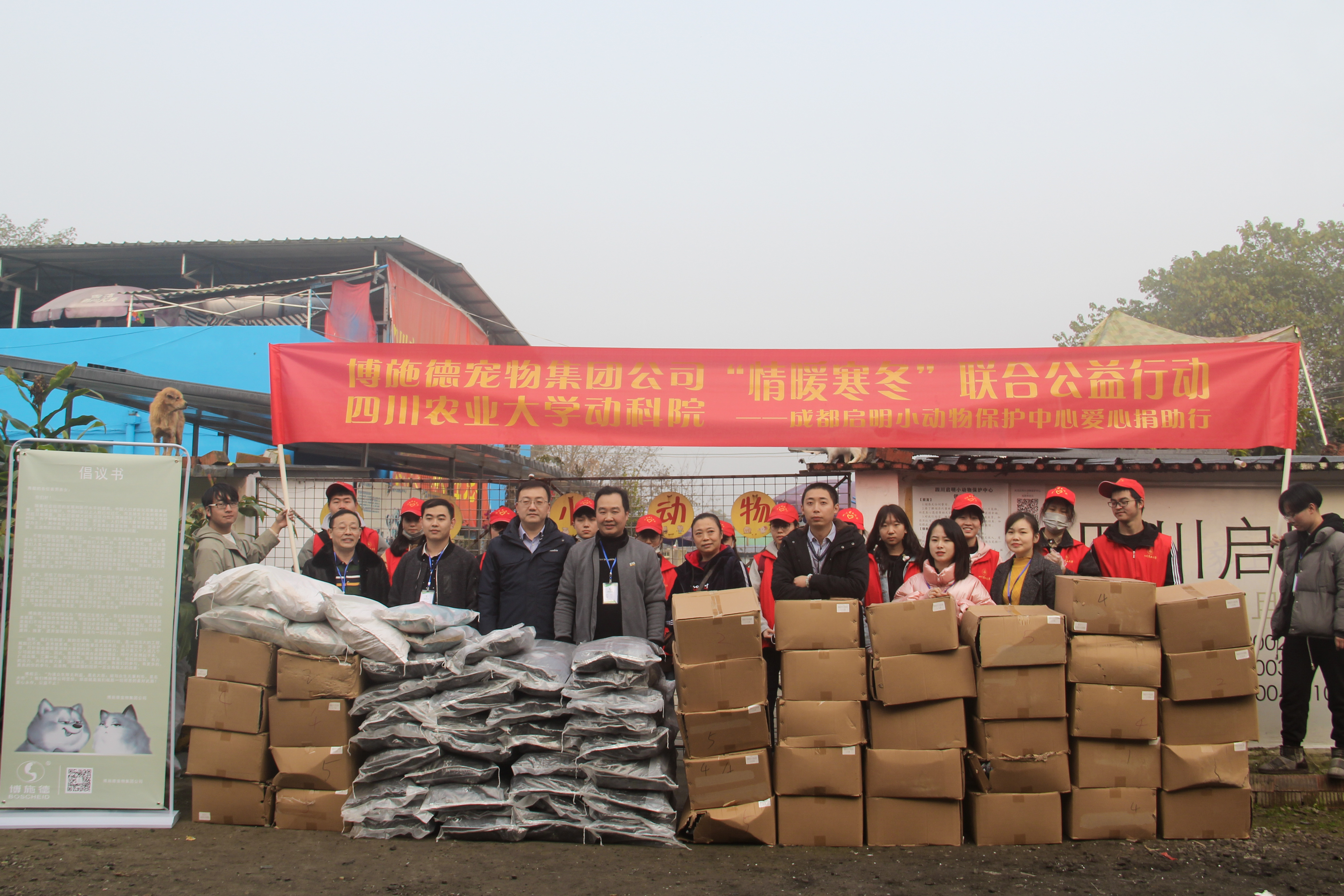12月10日上午,动科学院与成都博施德宠物用品有限公司开展“情暖寒冬”联合公益行动,向启明小动物保护中心捐赠1吨猫粮狗粮,价值约4万元。成都博施德宠物用品有限公司董事长周渺、总经理冷祥吉,启明小动物保护中心负责人,学院学生志愿服务指导老师及10多名志愿者出席了捐赠仪式。