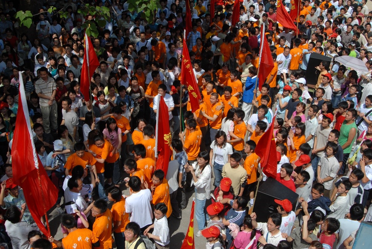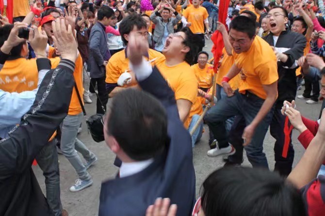 2006年4月举行的第32届校运会,当时我是学院团委组织部的一名干事,因为组织部负责拔河队的后勤工作,我需要做的工作就是在每天晚上拔河队训练时,用我那辆70元买的没有刹车的N手自行车将拔河绳和桶装水从新校区驼到老校区四教后面的篮球场边,那里有几棵环抱的大树,是拔河队训练的场地,每天的训练就是队员们把拔河绳栓在树上,和树对拔,一遍一遍的重复起绳、压绳、挺腰、发力等技术动作。我们后勤队员在他们训练间歇就要送上温热水,帮他们揉肩、甩手,我非常羡慕那些能够上绳的大块头运动员的,自己因为当时只有60公斤的体重肯定不能拔河,只有搞后勤服务工作,训练到后期,学生会的师兄师姐就会组织专门的陪练队跟主力队对拔,偶尔我就有机会上绳去过下瘾。再到后面,每天晚上由青年先锋队队员组成的啦啦队还要跟拔河队进行合练,八名旗手列成两队,平均站在拔河队员的两边,两名鼓手先敲一段“将军令”,啦啦队开始热场,然后领喊一声令下,啦啦队开始喊“1、2、1、2”,旗手要整齐划一的压旗,鼓声、啦啦队的口号和旗手压旗的动作跟运动员发力的节奏必须完全一致。正式比赛时,啦啦队领喊是动医03级的张俊山师兄,他威风凛凛的站在桌子上,负责控制队员进场和啦啦队的节奏,在赛前通过各种喊话激励我们的啦啦队大声呐喊,还要跟对手的领喊叫板,现场的气氛非常热烈之后双方的运动员才会在十几面红旗的带领下,在“将军令”的鼓声中和啦啦队的欢呼声中闪亮登场,然后双方啦啦队再是一阵比拼,比赛才正式开始,一场比赛下来,领喊的嗓子哑了,啦啦队员的嗓子也哑了。