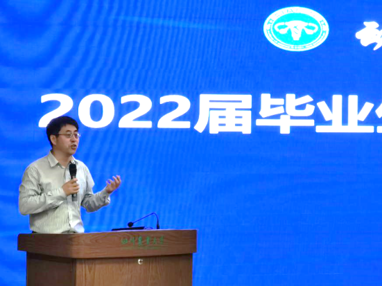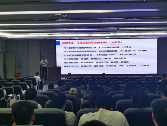 学院党委办公室主任董尧根据调研数据,分析了本届毕业生升学就业意愿,结合农牧行业就业形势,强调了求职关键时间,并讲授简历制作与面试技巧。