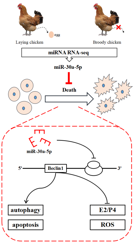 就巢性是禽类的一种母性行为,是家禽自然繁殖后代的一种本能,具体表现为排卵退化和排卵终止,其实质就是卵泡闭锁。永利官网尹华东教授团队以自主培育的国家级优质鸡配套系“天府肉鸡”为模型,挖掘筛选调控鸡卵泡发育的重要候选因子。通过对正常生长发育的鸡卵泡和闭锁卵泡miRNA转录组测序发现miR-30a-5p表达量存在明显差异,推测其可能影响卵泡发育。随后,在体外培养的鸡原代卵泡颗粒细胞中发现miR-30a-5p靶向抑制细胞自噬标志因子Beclin1基因的表达;干扰和过表达miR-30a-5p后,通过qPCR、Western Blot、流式细胞术、ELISA等技术检测发现miR-30a-5p可明显影响颗粒细胞凋亡、自噬以及雌二醇和孕酮激素合成;通过共聚焦显微镜和透射电子显微镜观察发现miR-30a-5p还可影响自噬溶酶体产生。综上结果表明,miR-30a-5p通过干扰Beclin1基因表达抑制鸡卵泡颗粒细胞的自噬和凋亡,并促进类固醇激素的产生,从而缓解卵泡萎缩。本研究结果为系统全面的解析小RNA调控鸡卵泡发育的分子机理提供基础,为进一步提高我国地方鸡的繁殖性能提供理论依据。