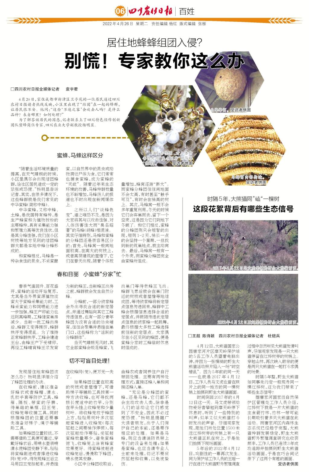4月20日,家住成都市新津区兰亭苑的一位居民通过四川农村日报读者热线反映,小区里出现了“结团”在一起的蜂群,让居民很不安。他问:“这些‘不速之客’会攻击人吗?是什么品种?来自哪里?如何处理?”
