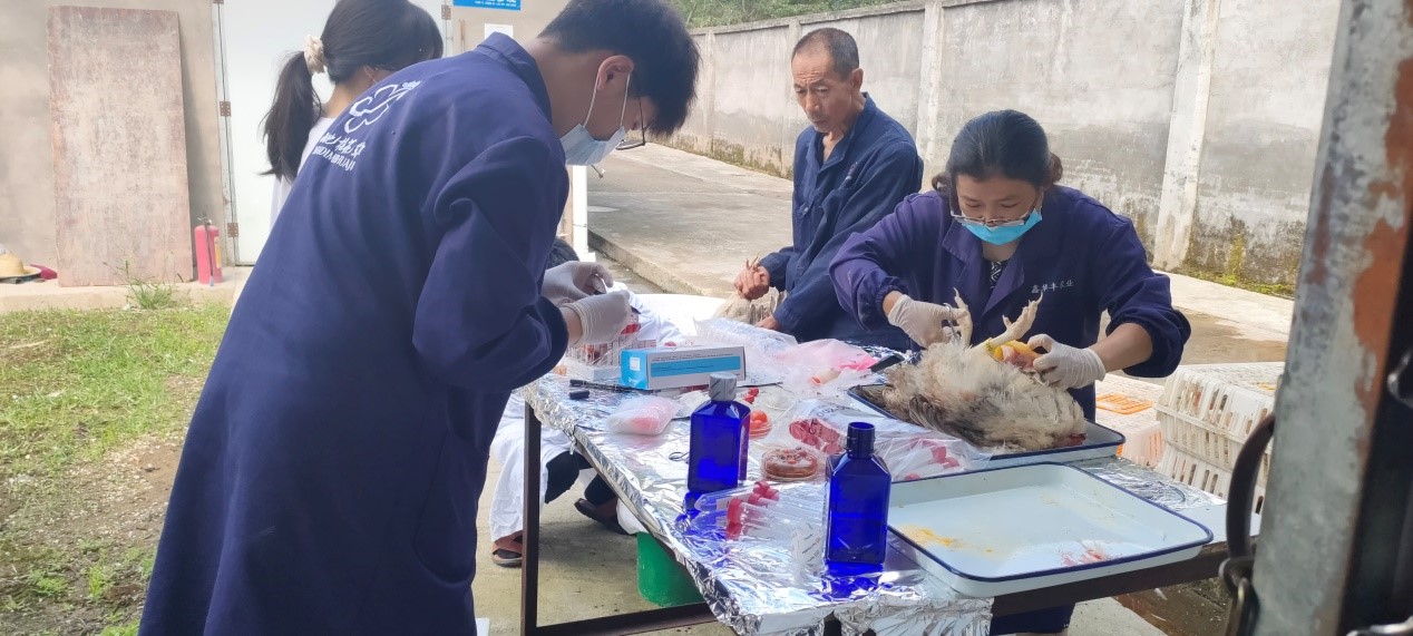 赵小玲教授一行与通江原乡农业梅花鸡发展有限公司负责人一同查看了场内鸡群和设施设备情况,查阅了梅花鸡核心保种群保种资料,分析了梅花鸡种群、保种场存在的问题,提出了现场生产管理的改进措施和下一步工作计划。林居纯教授根据公司反映的鸡群产蛋下降情况,挑选异常个体进行剖检,并采集病理组织带回实验室作疾病分析,同时提出了主要疫病的治疗方案。研究生完成了繁殖相关样本的采集,将在实验室做进一步遗传分析。