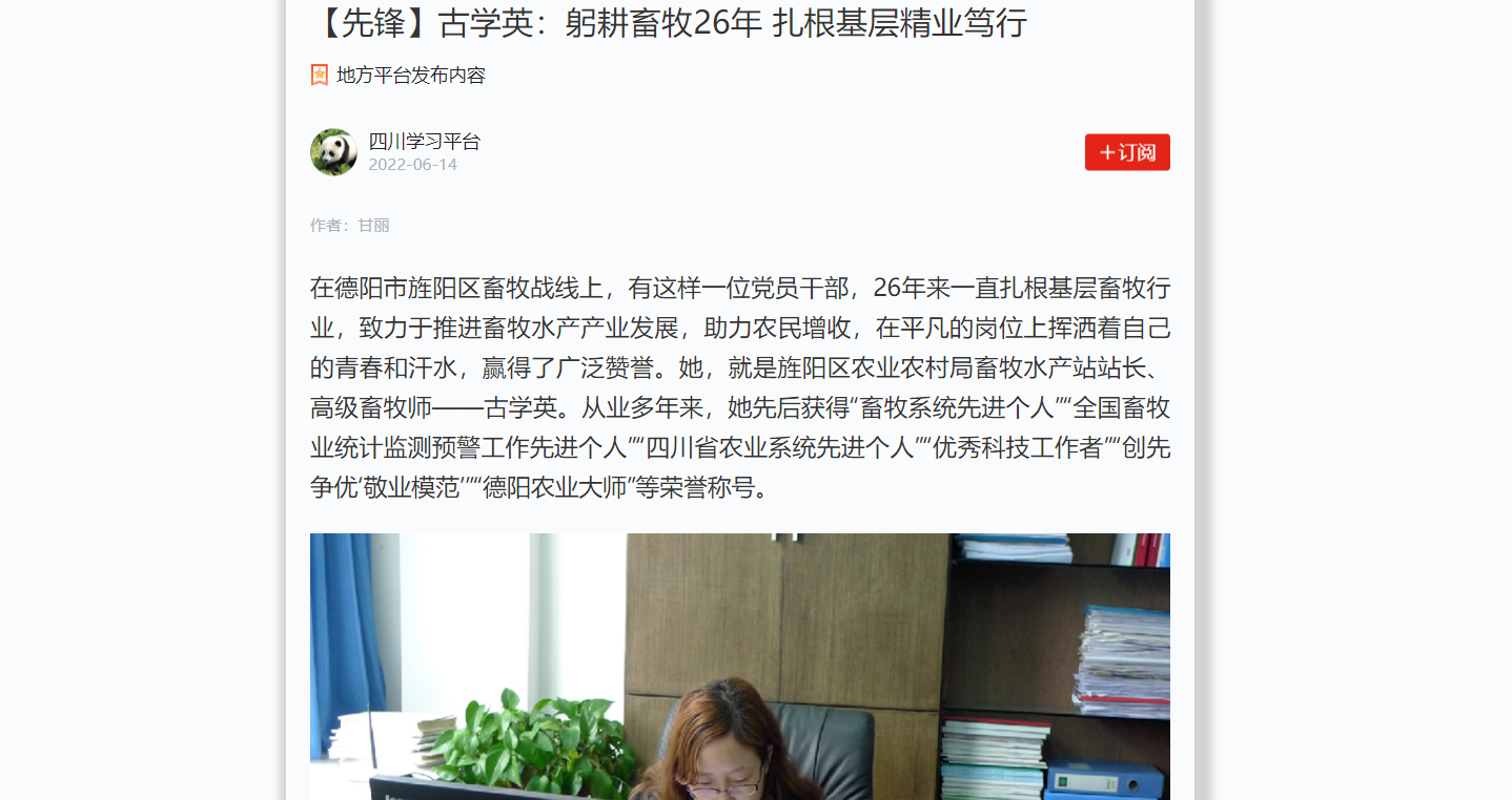 在德阳市旌阳区畜牧战线上,有这样一位党员干部,26年来一直扎根基层畜牧行业,致力于推进畜牧水产产业发展,助力农民增收,在平凡的岗位上挥洒着自己的青春和汗水,赢得了广泛赞誉。她,就是旌阳区农业农村局畜牧水产站站长、高级畜牧师——古学英。从业多年来,她先后获得“畜牧系统先进个人”“全国畜牧业统计监测预警工作先进个人”“四川省农业系统先进个人”“优秀科技工作者”“创先争优‘敬业模范’”“德阳农业大师”等荣誉称号。