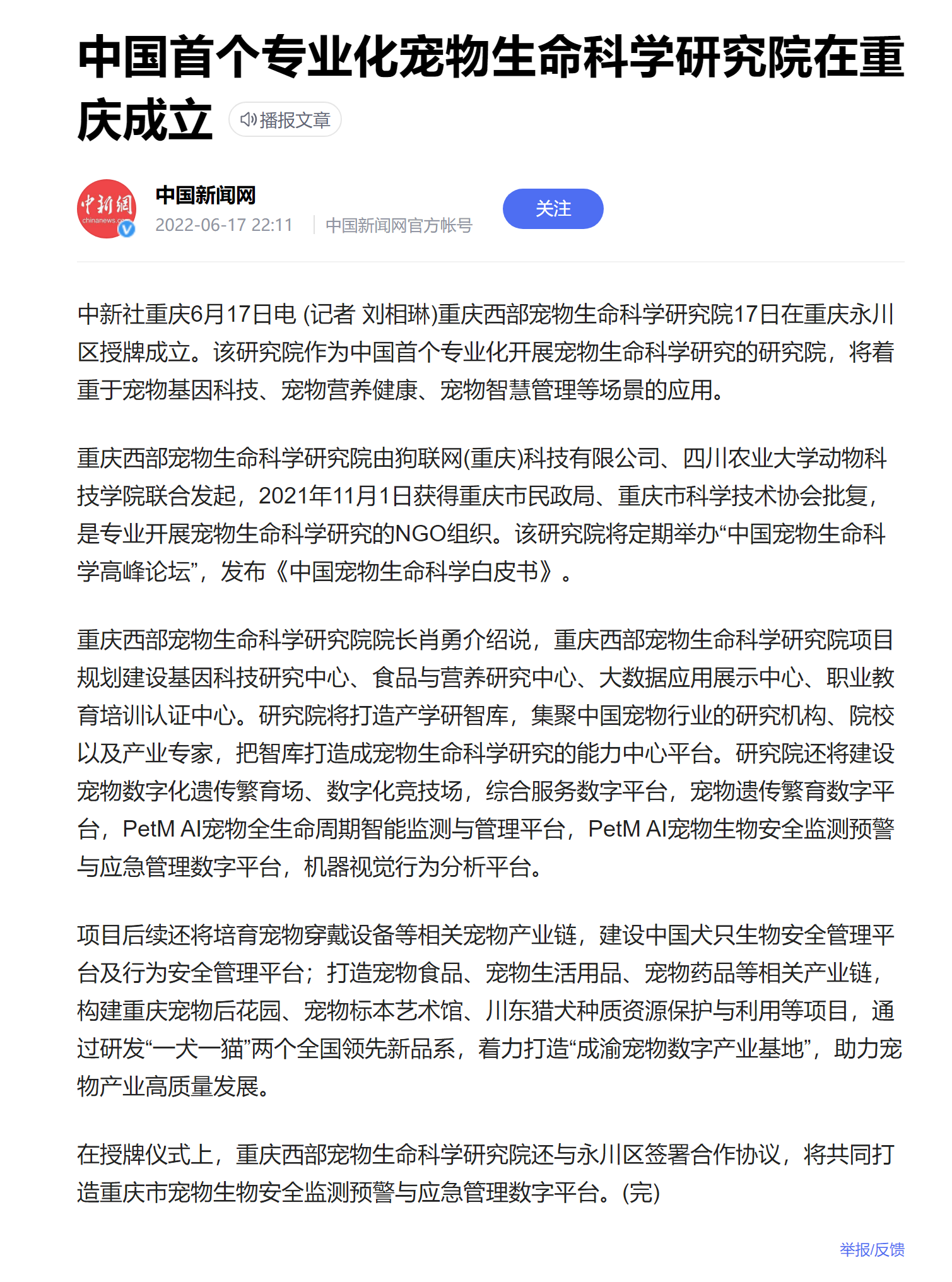 重庆西部宠物生命科学研究院17日在重庆永川区授牌成立。该研究院作为中国首个专业化开展宠物生命科学研究的研究院,将着重于宠物基因科技、宠物营养健康、宠物智慧管理等场景的应用。