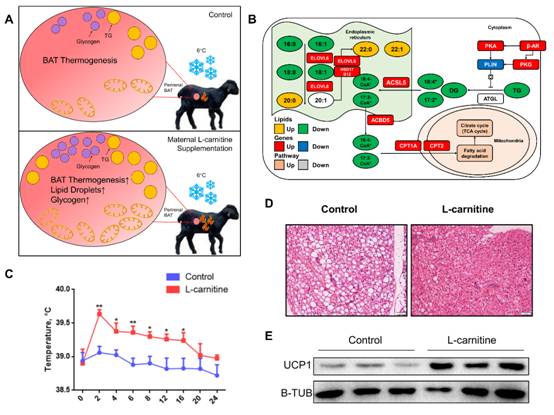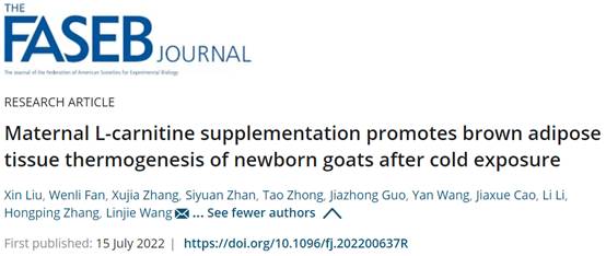 近日,yl6809永利官网羊遗传育种团队在国际知名期刊《美国实验生物学会联合会会志》《The FASEB Journal》(中科院TOP期刊,IF=5.834),发表了题为《寒冷刺激下母体添加肉碱促进羔羊棕色脂肪的产热作用》(Maternal L-carnitine supplementation promotes brown adipose tissue thermogenesis of newborn goats after cold exposure)的研究论文,该研究通过在母羊妊娠后期日粮中补充脂肪酸氧化代谢中间产物—肉碱,促进新生羔羊棕色脂肪的产热能力,进而使羔羊在寒冷条件下维持体温,提高羔羊成活率。