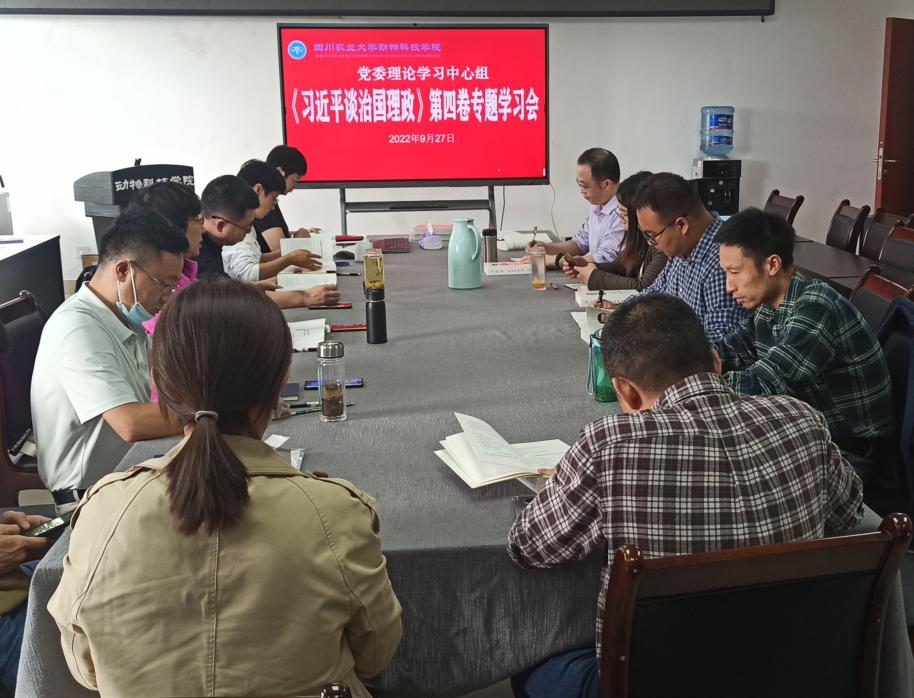 院长朱砺指出,要以深入学习《习近平谈治国理政》第四卷为契机,准确把握好新发展阶段的新要求,贯彻新发展理念,推动构建新发展格局,深入推进十四五目标任务落实,根据学校统一部署,进一步找准服务更高水平天府粮仓建设的着力点,为新时代打造更高水平“天府粮仓”提供更多动科学院的贡献。