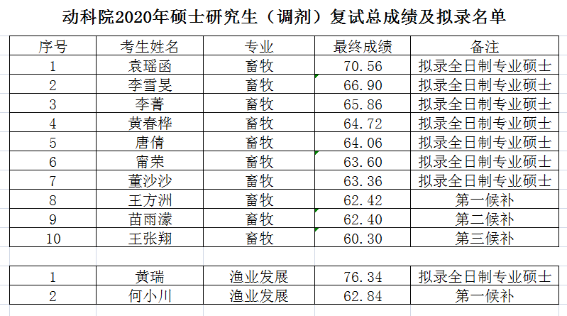 2020年6月2日,在yl6809永利官网研究生招生工作领导小组指导下,畜牧和渔业发展专业顺利完成硕士调剂远程复试工作,现将参与复试考生的总成绩及拟录取情况进行公示,公示期为2020年6月3日-6月12日。如对结果有疑问或异议,请向学院研究生招生工作领导小组反映,也可联系学科进行咨询和核实。