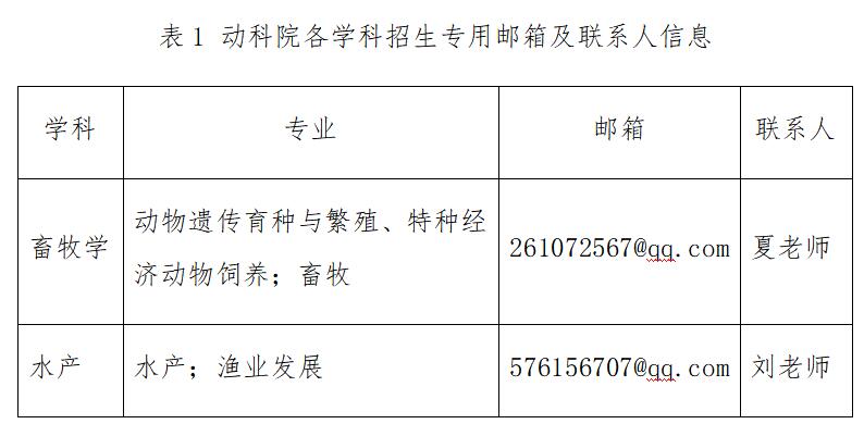 考生可将大学期间成绩单、科研成果、荣誉证书等作为证明其学习和科研能力的补充材料,材料(扫描或清晰拍照)整理合并成一个PDF文档,以“考生姓名+第一志愿报考专业名称”的格式命名该文档,于2022年3月24日下午18:00前,分别发送到动科院各学科招生专用邮箱(表1)。邮箱主题以该文档的名字命名,每名考生只发一个附件文档,请考生务必按要求发送邮件。