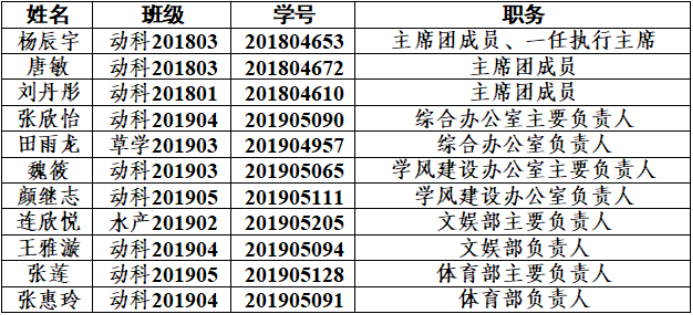 按照《学院关于团学组织主要学生干部换届调整的通知》相关要求,经学生自主申报、各部门初审推荐、换届工作领导小组进行资格复审及面试,由学代会通过后报经学院团委同意、学院党委确定,现将第十四届学生会主席团成员及工作部门(主要)负责人名单公布如下: